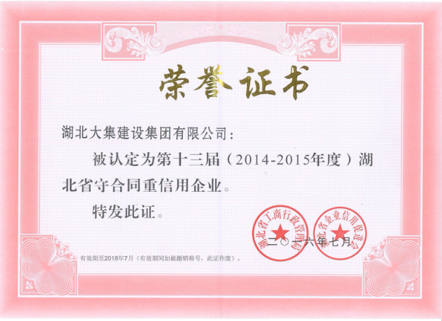 2016年10月17日我們湖北大集建設集團有限公司很榮幸被湖北省工商行政管理局和湖北省企業(yè)信用促進會聯(lián)合評定為2014—2015年度“守合同重信用企業(yè)”,這也是今年大集地區(qū)唯一一家獲評企業(yè)。