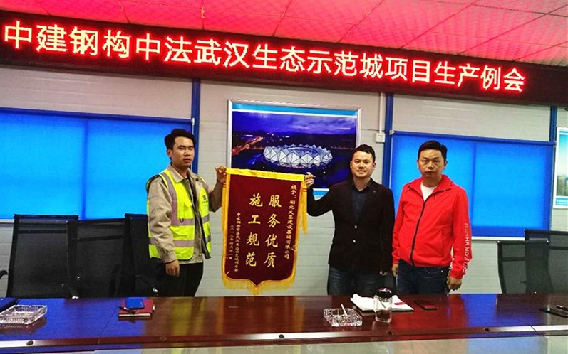 2018年4月13日,由集團公司參與承建的中法新城規(guī)劃館項目獲得中建鋼構(gòu)嘉獎,授予“施工規(guī)范,服務(wù)優(yōu)質(zhì)”的錦旗,項目經(jīng)理徐斌和工程部副部長陳超共同接受了這一榮譽。