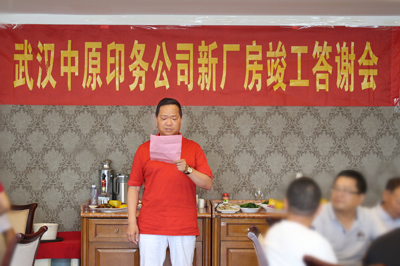 6月26日,武漢中原印務(wù)有限責(zé)任公司隆重舉行新廠房竣工答謝會,集團(tuán)副總經(jīng)理徐家富、項(xiàng)目經(jīng)理田建新、招投標(biāo)部部長胡鵬、財(cái)務(wù)部部長鄧雪芬等受邀出席。