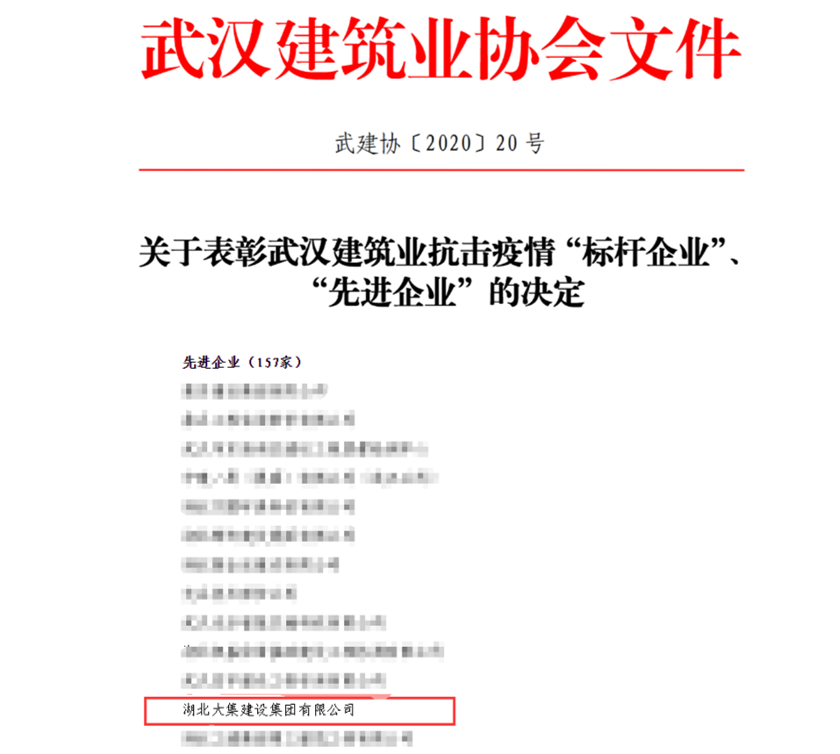4月14日,武漢建筑業(yè)協(xié)會發(fā)布《武建協(xié)〔2020〕20 號——關(guān)于表彰武漢建筑業(yè)抗擊疫情“標(biāo)桿企業(yè)”、“先進(jìn)企業(yè)”的決定》,對在抗疫“主戰(zhàn)場”積極擔(dān)責(zé),奮不顧身、盡銳出戰(zhàn),與死神賽跑、與疫魔競速的27家武漢建筑業(yè)“標(biāo)桿企業(yè)”、157家“先進(jìn)企業(yè)”進(jìn)行表彰。湖北大集建設(shè)集團(tuán)因在抗疫過程中主動作為、勇于擔(dān)當(dāng),獲評“先進(jìn)企業(yè)”榮譽(yù)稱號。