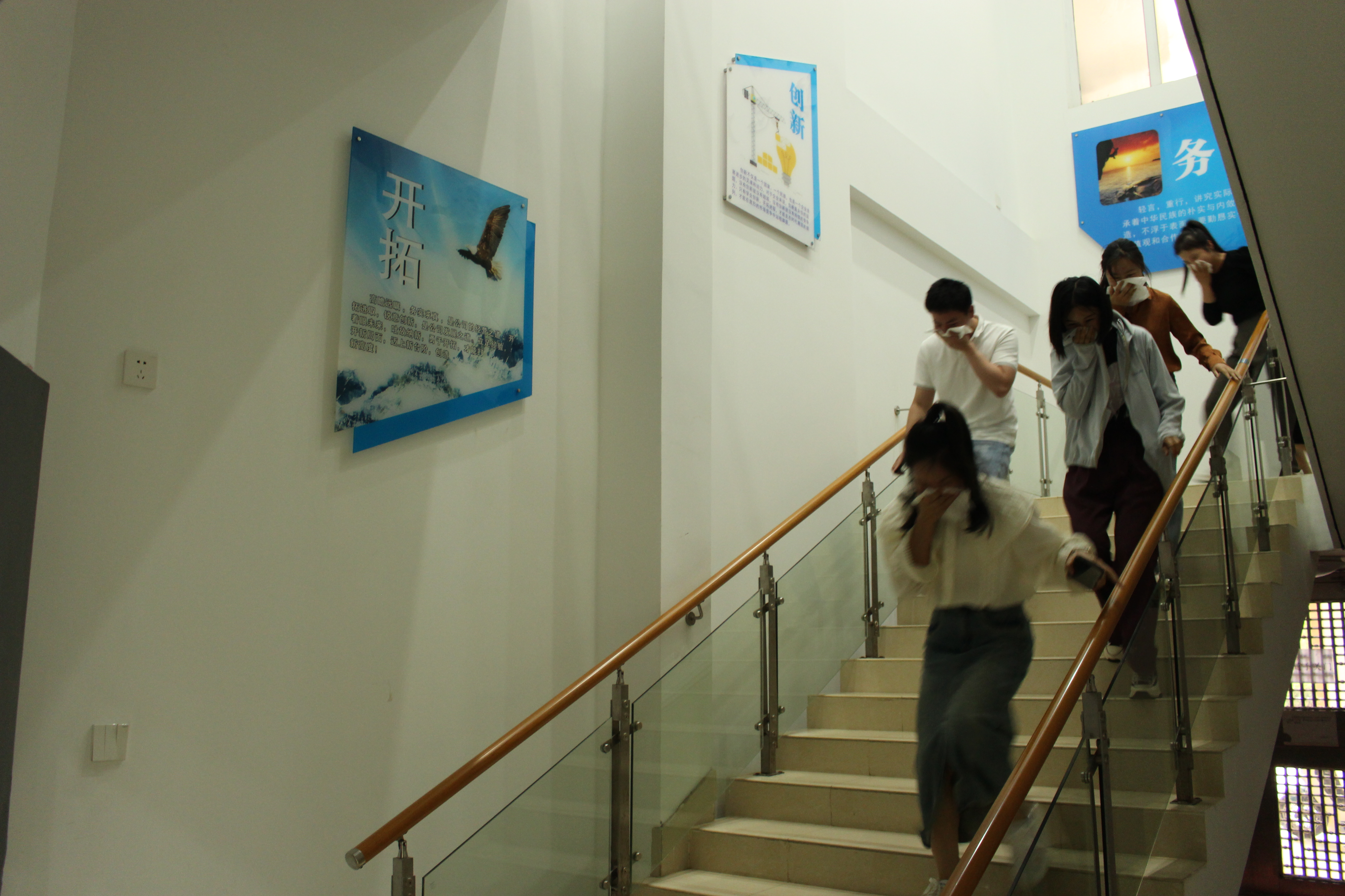 在火災(zāi)發(fā)生逃生演習(xí)中,隨著一聲“著火了”,全體人員用毛巾捂住口鼻、彎腰前行,按照逃生路線有序撤離,安全抵達(dá)指定緊急集合點。