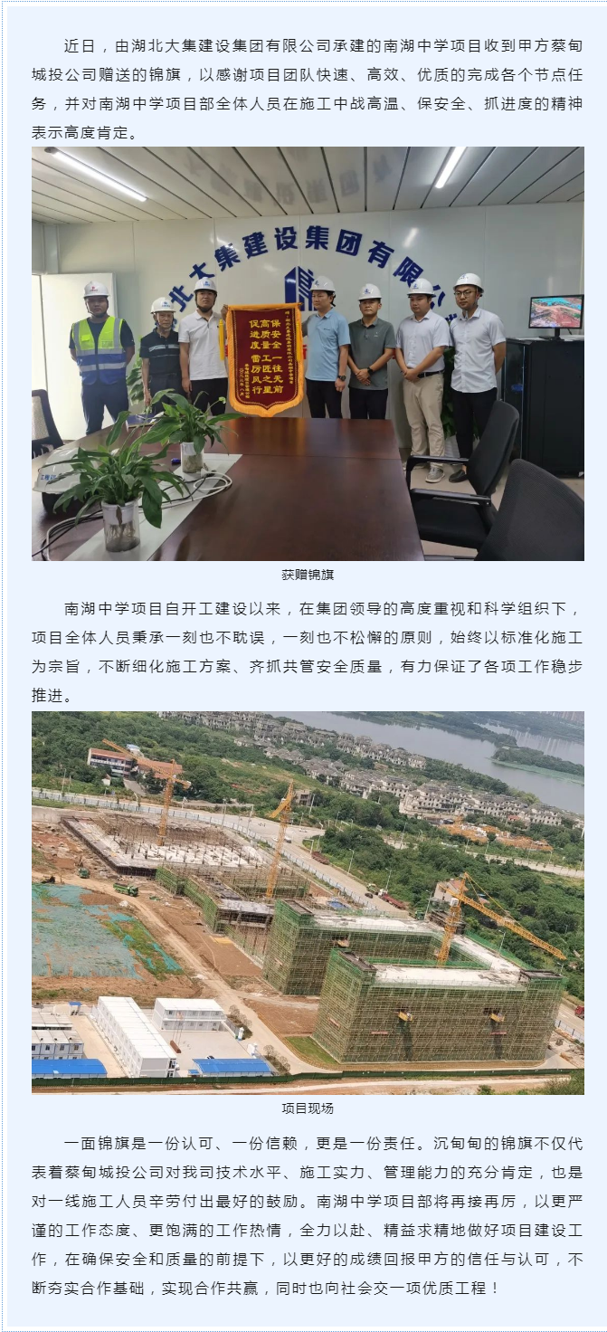 精心施工贏贊譽(yù),甲方單位送錦旗|南湖中學(xué)項(xiàng)目獲贈錦旗