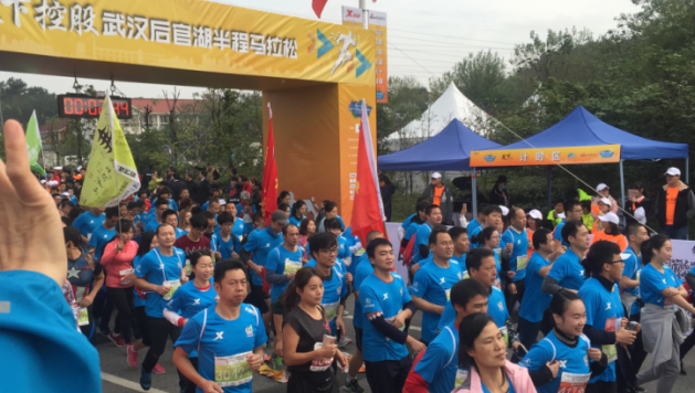 當(dāng)時(shí)鐘快指向八點(diǎn)半時(shí),比賽現(xiàn)場(chǎng)人頭顫動(dòng)歡呼聲一片,緊接著只聽(tīng)見(jiàn)發(fā)號(hào)令槍一響,所有參賽人員像草原上奔騰的駿馬如潮水般的涌向整個(gè)跑道,布滿了整條5公里長(zhǎng)的五賢路賽道,猶如一片藍(lán)色的海洋。參加健康跑的參賽人員跑到5公里處完成比賽,然后折返主會(huì)場(chǎng)觀看半馬比賽,為所有參賽者鼓勁加油!