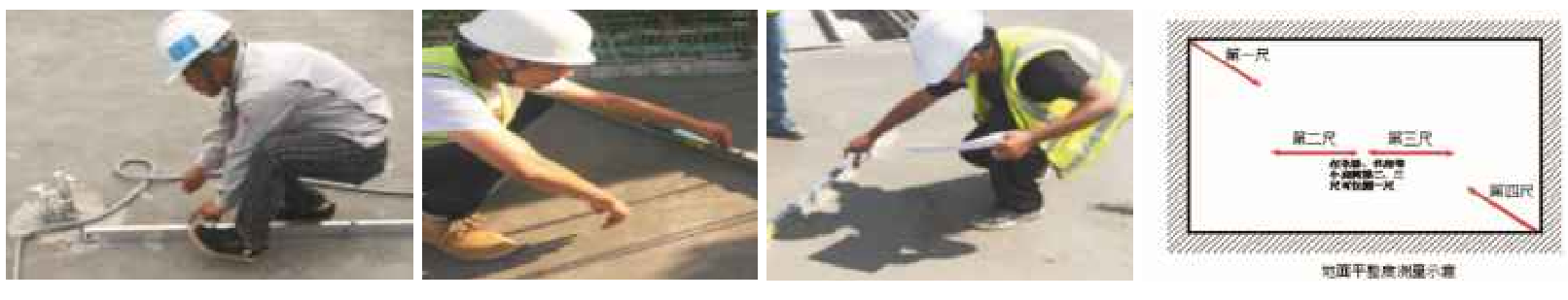 2.任選同一功能房間地面的2個(gè)對(duì)角區(qū)域,按與墻面夾角45度平方靠尺測(cè)量2次,加上房間中部區(qū)域測(cè)量一次,共測(cè)量3次???餐廳或較大房間地面的中部區(qū)域需加測(cè)1次;