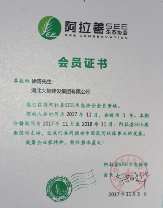 2017年11月,集團(tuán)董事長徐濤攜湖北大集建設(shè)集團(tuán)加入阿拉善SEE生態(tài)協(xié)會(huì),正式成為阿拉善SEE會(huì)員,與各界熱心環(huán)保的社會(huì)人士共同推動(dòng)民間環(huán)保事業(yè)的發(fā)展,努力為阿拉善沙漠筑起最美的防護(hù)墻!